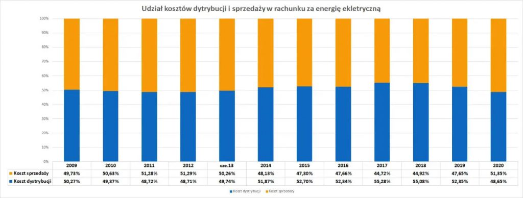 W praktyce okazuje się, że z perspektywy ostatnich lat coraz więcej płacimy za sprzedaż prądu, a tylko nieznacznie więcej za dystrybucję. Pokazuje to poniższa grafika.