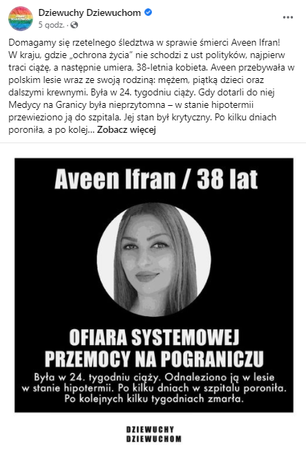„Należy pamiętać, że każdy przypadek śmierci jest rezultatem konkretnych decyzji politycznych wykonywanych przez konkretnych funkcjonariuszy. Znaleźliśmy się w niebezpiecznym momencie – przemoc państwowa stała się w Polsce obowiązującym prawem. Jeszcze kilka miesięcy temu to, co dziś uznawane jest za normę, byłoby nieakceptowalne, a każdy przypadek śmierci wiązałby się ze wszczęciem dochodzenia i ustaleniem sprawcy”, piszą aktywiści Grupy Granica, którzy domagają się śledztwa w sprawie śmierci Aveen Ifran.