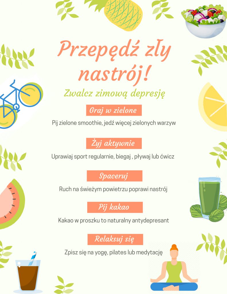 By proces uwalniania serotoniny do mózgu odbywał się regularnie, niezbędny jest cukier. Owoce są znacznie lepszym źródłem węglowodanów niż słodycze, do tego zawierają mnóstwo witamin i minerałów. Dla przykładu Banany to źródło tryptofanu, witaminy B6, a także magnezu i potasu. Pierwiastki te odpowiedzialne są za prawidłowe działanie układu nerwowego. Jeśli połączysz banana z mrożonymi malinami, kawałkiem jabłka, startym imbirem, garścią szpinaku i dodasz łyżeczkę sproszkowanych alg lub białko konopne (bogate w kwasy omega i aminokwasy) uzyskasz doskonały, zielony koktajl śniadaniowy, który zapewni stabilny nastrój zimą. Tylko pomyśl co stanie się, gdy będziesz go pić regularnie.