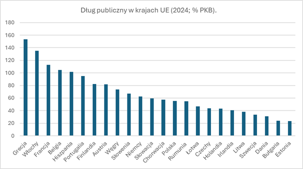 Z opracowanego raportu Mario Draghiego przygotowanego na zlecenie Komisji Europejskiej wynika, że Europa wymaga radykalnych zmian w polityce wspólnotowej[1]. Produkt Krajowy Brutto UE ma osiągnąć w 2030 r. poziom 23,94 bln USD a w krajach Azji i Pacyfiku ponad 2-krotnie więcej. PKB samych Chin kontynentalnych wyniesie 25,83 bln USD. Jeszcze w 2000 r. produkt krajowy brutto UE był prawie 6-krotnie wyższy niż gospodarki Chin, a w 2010 r. już tylko 2,4-krotnie. W 2030 r. PKB Chin będzie większy od PKB Unii Europejskiej o prawie 8%. W obliczu deficytów budżetowych w krajach UE prognozy te wskazują na potrzebę zmian w strukturze wydatków publicznych. Tylko cztery kraje z wymienionych na rys.1. nie miały na koniec 2024 r. ujemnego salda w bilansie dochodów i wydatków publicznych. Są to Dania, Grecja, Irlandia i Portugalia. Pozostałe kraje wykazały saldo ujemne. Deficyty budżetowe, które ostatecznie przekładają się na dług publiczny nie są same w sobie destrukcyjne. Zależy to od dwóch podstawowych czynników, tj. kosztów obsługi zadłużenia a głównie od tego, na co te dodatkowe środki są przeznaczane.