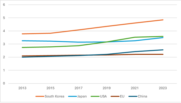 Źródła sukcesu w zakresie innowacji są ogólnie znane, ale nie wszędzie doceniane. Najbardziej innowacyjne kraje wykazują pewne cechy wspólne, mianowicie rozwinięty system badań, duże nakłady na B+R i uznanie innowacyjności jako strategiczny element polityki gospodarczej. Celem takiej polityki jest promocja technologii, dyfuzja innowacji oraz rozwój sektora technologii informacyjnych i komunikacyjnych (ICT). Wyraźnie to widać na przykładzie Korei Południowej, która jest światowym liderem w tej dziedzinie (rys.1). Unia Europejska z nakładami na badania i rozwój sięgającymi niewiele ponad 2% PKB znajduje się daleko w tyle za światową czołówką. Europę wyprzedziły nawet Chiny, które w 2023 r. wydawały na sektor B+R już 2,56 % PKB. W dwóch wiodących pod tym względem krajach, tj. w Korei Południowej i Stanach Zjednoczonych nakłady na ten cel wynosiły odpowiednio 4,85% i 3,59 % PKB. Takiego poziomu nie osiągną żaden kraj Unii Europejskiej. Tylko w pięciu krajach UE nakłady przekroczyły 3% PKB, są to: Szwecja (3,57), Belgia (3,32), Austria (3,29), Niemcy (3,11) i Finlandia (3,09). Polska ze wskaźnikiem 1,56 % PKB sytuuje się w środkowej strefie rankingu. W innych krajach Europy Centralnej i Wschodniej nakłady te kształtują się znacznie poniżej 1% PKB. W tej sytuacji bez wspólnej polityki gospodarczej w zakresie innowacyjności Europa jako cały region będzie tracić zdolność konkurencyjną i powiększać dystans do głównych graczy na globalnym rynku.