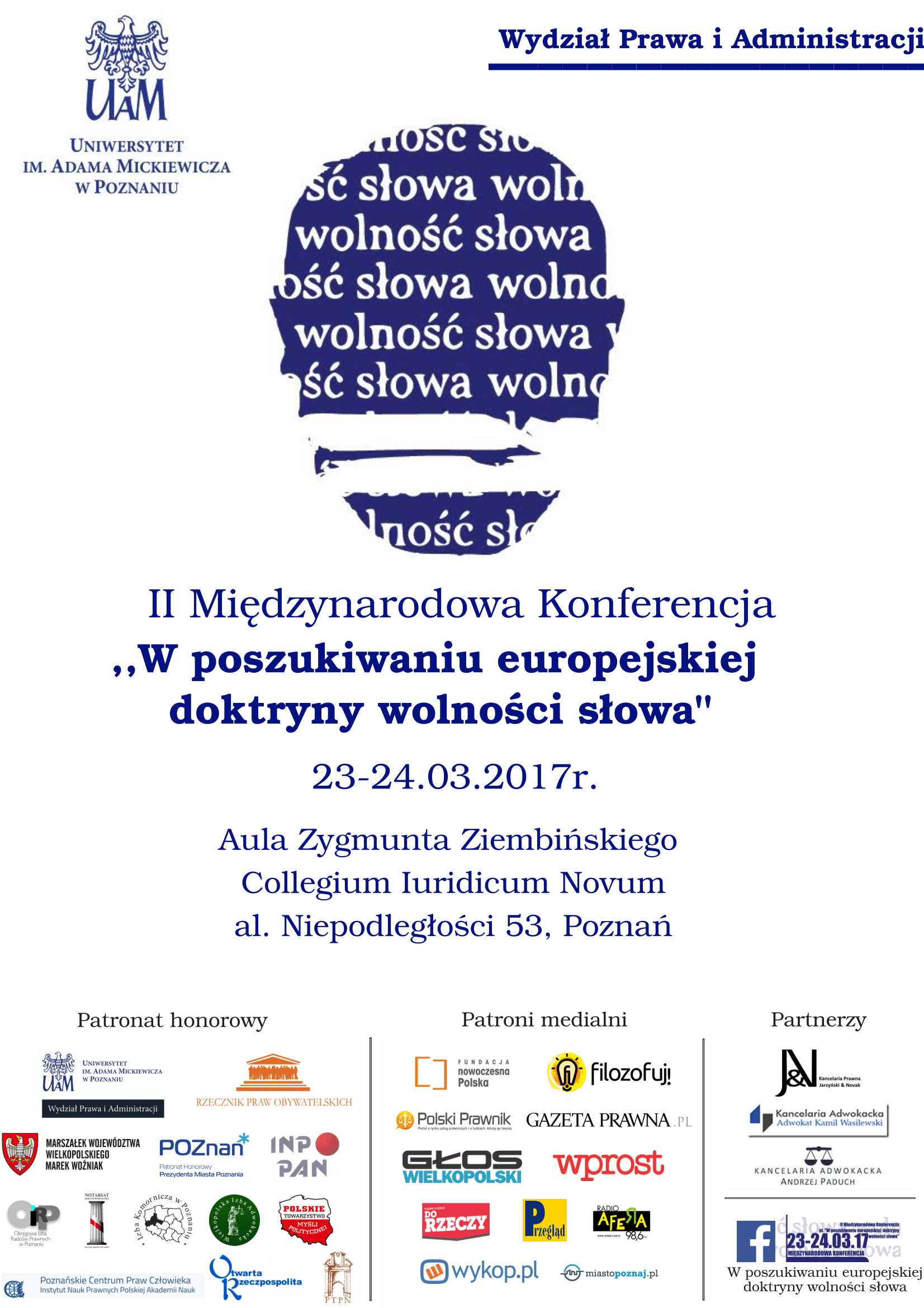 Jaka jest rola swobody wypowiedzi w porządku prawnym demokracji liberalnej? Jak rozwiązać konflikt wolności słowa z innymi uprawnieniami i wartościami chronionymi przez prawo? Odpowiedziom na te (jakże aktualne!) pytania będzie poświęcona II edycja Międzynarodowej Konferencji pt. „W poszukiwaniu europejskiej doktryny wolności słowa”, która odbędzie się w dniach 23-24 marca 2017 r. na Wydziale Prawa i Administracji Uniwersytetu im. Adama Mickiewicza w Poznaniu. Swój udział potwierdzili najbardziej prominentni badacze wolności słowa w Polsce (w tym byli sędziowie Sądu Najwyższego i Trybunału Konstytucyjnego). Ponadto gościć będziemy licznych prelegentów z zagranicy, m.in. ze Stanów Zjednoczonych, Holandii, Niemiec, Hiszpanii, Egiptu, Ukrainy i Cypru.