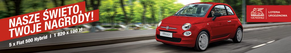 Z okazji swoich 190. urodzin Generali przygotowało dla swoich klientów wielką loterię, w której można wygrać jeden z pięciu hybrydowych Fiatów 500 oraz ponad 1800 nagród pieniężnych o wartości 100 zł. Aby wziąć udział w loterii należy w terminie 22.03-20.06, w TU Generali lub Proama, wznowić lub kupić polisę komunikacyjną w pakiecie z ubezpieczeniem NNW w pojeździe na stronie mfind.pl. Po opłaceniu polisy koniecznie trzeba się zarejestrować na stronie loterii. Więcej szczegółów znajdziesz w regulaminie loterii (https://www.mfind.pl/wp-content/uploads/2021/04/C2_REGULAMIN_LOTERII_URODZINOWEJ_GENERALI.pdf).