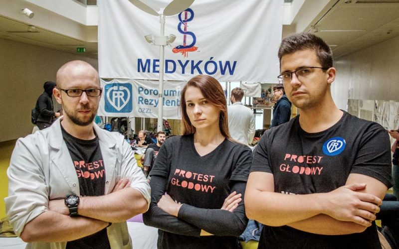 Piotr Matyja był najdłużej głodującym uczestnikiem protestu młodych lekarzy. Dwa miesiące później rozpoczyna rezydenturę na psychiatrii Lekarka protestu rezydentów zdyskwalifikowała go w piątek, 13 października. Musiał zakończyć głodówkę, choć twierdził, że czuje się świetnie i nadal może protestować. Dwa miesiące później, 13 grudnia, Piotr Matyja jest w domu. Trzeci dzień nie poszedł do pracy, ma zwolnienie. W sobotę zaraził się rotawirusem. Przypuszcza, że obniżenie odporności to skutek październikowego protestu. Organizm takich rzeczy jak 12-dniowa głodówka nie zapomina i nie wybacza. Pokłosie Piotr był najdłużej głodującym uczestnikiem protestu rezydentów. W ciągu 12 dni schudł 7 kg. Teraz wrócił do normalnej wagi. Znów się uśmiecha. Nawet wtedy, gdy czuje się tak paskudnie, jak może się czuć osoba zarażona rotawirusem. – W sobotę mój dwuletni siostrzeniec miał arytmię. Siostra poprosiła, bym pojechał z jej mężem i synem do szpitala pediatrycznego – wspomina Piotr. – Rysio został przyjęty na oddział na obserwację. Na szczęście wypisano go w niedzielę. A właśnie w niedzielę zaczęła się moja choroba. Pewnie złapałem rotawirusa w szpitalu. Przez dwa dni Piotr ledwo mógł się ruszyć. Nie był w stanie się nawodnić, bo cokolwiek wypił, od razu zwracał. Nic nie jadł. Starał się z nikim nie kontaktować, bo wirus jest bardzo zakaźny. – Myślę, że infekcja ma związek z głodówką – twierdzi. – Nie chorowałem od lat, ale od zakończenia głodówki, kiedy adrenalina i kortyzol opadły, czuję się coraz gorzej. Przy przyjęciu do pracy zrobiono mi podstawowe badania i tak słabych wyników u siebie nie pamiętam. Niedobory wychodzą dopiero teraz. Od 1 grudnia Piotr jest rezydentem w psychiatrycznym Szpitalu Nowowiejskim w Warszawie. Mówi, że już mu brakuje szpitala, choć to dopiero trzeci dzień choroby. Bo on po prostu lubi pomagać ludziom. – Nie chcę narażać pacjentów i innych lekarzy na zarażenie, dlatego zdecydowałem się zostać w domu zgodnie ze zwolnieniem – tłumaczy. – Na moim oddziale jest wiele bardzo obciążonych osób, dla których wirus mógłby się okazać ogromnie niebezpieczny. Na szczęście dopiero zacząłem specjalizację i mogę sobie pozwolić na to, żeby nie przyjść do pracy, gdy lekarz wystawił mi zwolnienie. Wielu moich przyjaciół niestety słyszy: „Nie obchodzi mnie, czy będziesz chory, czy umierający. Masz przyjść!”. No i co ma wtedy zrobić lekarz około trzydziestki? Oczywiście leczy się objawowo i pracuje. Znajoma lekarka opowiadała mu o lekarzu, który z grypą przyszedł na ciężki dyżur. Pomimo młodego wieku mężczyzna dziś nie jest w stanie przejść kilku kroków bez zadyszki. – Teraz czeka na przeszczep serca – wyjaśnia Piotr. – Dylemat czysto etyczny: jeżeli lekarz nie przyjdzie z powodu choroby, jego współpracownicy, mimo przeciążenia pracą, będą musieli zająć się także jego pacjentami. A jeżeli jednak przyjdzie, może być źródłem zakażenia dla ciężko chorych pacjentów. Co zrobić w takim przypadku? Ósma przeprowadzka Przedwojenny budynek na starym Żoliborzu tonie w słońcu. Piotr mieszka tu od półtora miesiąca. – Przez cały okres studiów i na stażu wynajmowałem pokoje za 500-600 zł. Przeprowadzałem się osiem razy. Ostatnio w Brwinowie właścicielka mieszkania oszczędzała i słabo ogrzewała pokoje, a łazienki w ogóle nie – mówi Piotr. Teraz wynajmuje piękny pokój: przestronny, z parkietem w jodełkę i szafą o eleganckim fornirze. Wyposażenie staroświeckie, bo mieszkała tu kiedyś wiekowa pani. Jedynie kuchnia zabudowana jest nowoczesnymi szafkami i urządzeniami. Urszula i jej siostra Helena wynajęły to mieszkanie kilka lat temu. Obie, podobnie jak Piotr, studiowały medycynę na Warszawskim Uniwersytecie Medycznym. Urszula i Piotr byli nawet w jednej grupie, Helena rozpoczęła studia dwa lata wcześniej. Zawsze się kolegowali. Urszula wiele razy organizowała domówki dla studentów z roku, więc Piotr znał już to mieszkanie. Kiedy 13 października musiał przerwać głodówkę, Piotr postanowił wspomagać głodujących. Miał urlop, mógł go rozdysponować, jak chciał. Nie wrócił do wynajętego pokoiku w Brwinowie, spał u znajomych, czasem u siostry na Służewcu. A rano zjawiał się w szpitalu, w którym trwał protest. 30 października Ogólnopolski Związek Zawodowy Lekarzy zdecydował, że głodówki w całym kraju zostaną zakończone. Tego dnia kończył się także staż Piotra w szpitalu