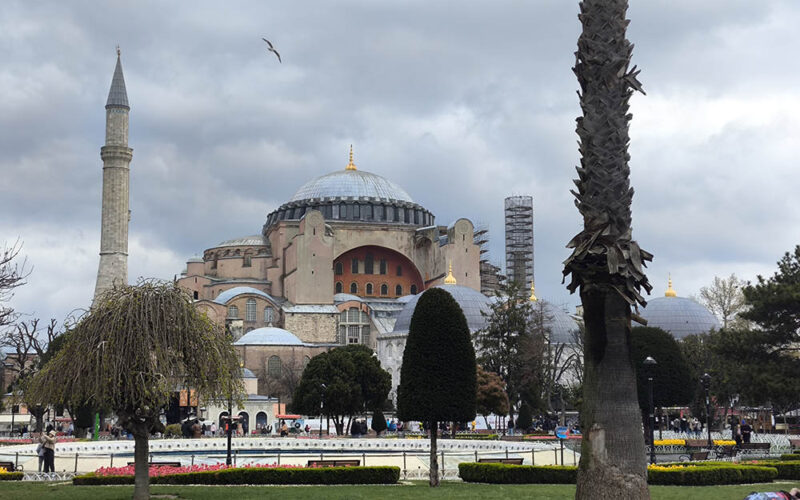 Przed meczetem Hagia Sophia jak zwykle tłum turystów oczekuje w karnej kolejce do kas. Po tym jak w 2021 r. muzeum znów stało się meczetem, wstęp przez kilka lat był darmowy, jednak ostatnio znów zmieniono decyzję. Darmowy dla wiernych pozostał wyłożony turkusowym dywanem parter świątyni, zwiedzający płacą za wstęp na galerię. Pnę się więc w górę, słuchając, jak przewodnik opowiada grupie turystów o planowanej renowacji Hagii Sophii.