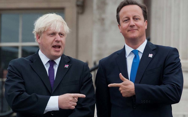 (FILES) This file photo taken on August 24, 2012 shows British Prime Minister David Cameron (R) and London Mayor Boris Johnson (L) pointing at each other as the London 2012 Paralympic Cauldron is lit in London's Trafalgar Square, on August 24, 2012. Prime Minister David Cameron made a last-ditch appeal to London Mayor Boris Johnson on February 21, 2016 to support Britain staying in the EU as battle lines hardened ahead of a June 23 membership referendum. / AFP / WILL OLIVER