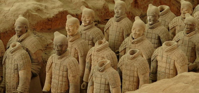 Czas: rok 210 p.n.e. Właśnie zmarł bezlitosny chiński cesarz Qin Shi Huangdi. Zgromadził armię, która ma go poprowadzić w zaświaty – tysiące żołnierzy stoi teraz w równych szeregach. Są tu łucznicy i oficerowie, piechota i jazda, wszyscy zwróceni twarzą w stronę ziem, które Qin podbił, jednocząc pod swoim sztandarem całe Chiny. Gwardia cesarska stoi w czterech szeregach w dziesięciu pozornie niekończących się kolumnach, z włóczniami w dłoniach, gotowa odeprzeć atak. Ta armia nigdy nie śpi, bo nie są to zwykli żołnierze, ale naturalnej wielkości pomalowane kopie ludzi wykonane z terakoty (wypalonej gliny). Stanowią część ogromnego mauzoleum, które Shi Huangdi nakazał zbudować, gdy w wieku 13 lat objął władzę i został królem państwa Qin.