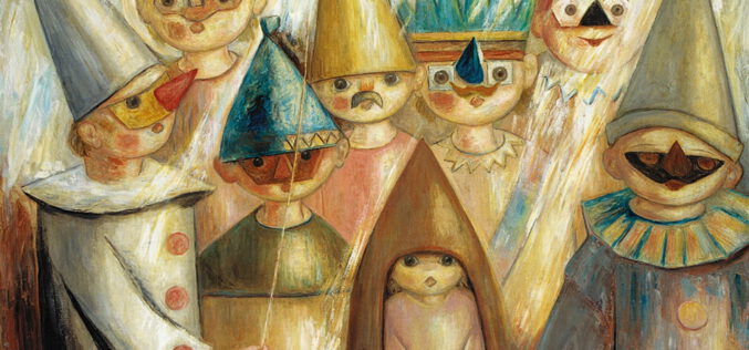 „Maskarada” Tadeusza Makowskiego, czyli dzieci z dreszczykiem W „Maskaradzie” Tadeusza Makowskiego mamy do czynienia z (para)magicznymi postaciami, marionetkami naśladującymi wyglądem dzieciarnię. Zostały przedstawione frontalnie i rozmieszczone w dwuszeregu niczym na fotografii klasowej. Jednak nawet jeżeli się uśmiechają, to budzą dreszczyk… Swoją obecnością czy swoją obcością? Walce i stożki torsów, kule twarzy sprawiają, że ci Pinokiowie wydają się wyciosani przez wyjątkowo niewprawnego Geppetta, który nie zaprzątał sobie głowy i rąk detalami. Walce, stożki, kule są nieprzypadkowe – przedstawianie