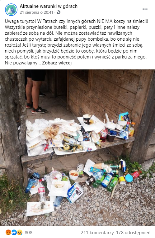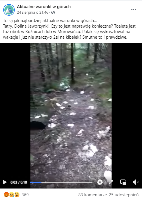 Z kolei na fanpagu „Aktualne warunki w górach” opublikowano film, na którym widać, jak tatrzański las w Dolinie Jaworzynki zamienił się w wielką toaletę z porozrzucanymi wszędzie chusteczkami. „Czy to jest naprawdę konieczne? Toaleta jest tuż obok w Kuźnicach lub w Murowańcu. Polak się wykosztował na wakacje i już nie starczyło 2 zł na kibelek? Smutne to i prawdziwe”, napisali autorzy posta.