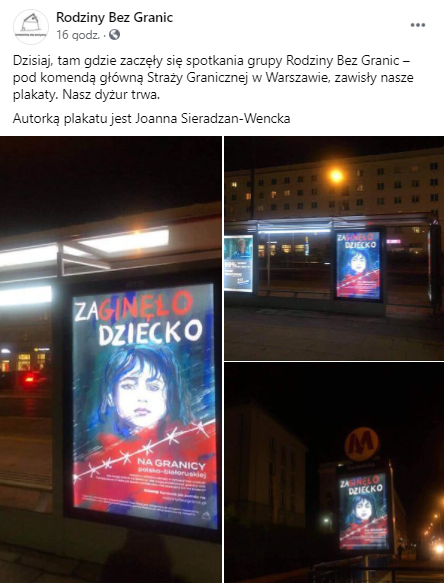 W odpowiedzi na wielotygodniowy kryzys humanitarny trwający na granicy polsko-białoruskiej, przed siedzibą Komendy Głównej Straży Granicznej pojawiły się plakaty z hasłem „zaginęło dziecko” przedstawiające jedną z kilkuletnich dziewczynek wywiezionych przez funkcjonariuszy do lasu na granicy. Akcję zainicjowała nieformalna grupa „Rodziny bez granic”.