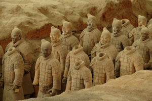 Rzymianie standardowo praktykowali kopiowanie dzieł i uprawiali recykling wcześniejszych pomysłów artystycznych Czas: rok 210 p.n.e. Właśnie zmarł bezlitosny chiński cesarz Qin Shi Huangdi. Zgromadził armię, która ma go poprowadzić w zaświaty – tysiące żołnierzy stoi teraz w równych szeregach. Są tu łucznicy i oficerowie, piechota i jazda, wszyscy zwróceni twarzą w stronę ziem, które Qin podbił, jednocząc pod swoim sztandarem całe Chiny. Gwardia cesarska stoi w czterech szeregach w dziesięciu pozornie niekończących się kolumnach, z włóczniami w dłoniach, gotowa odeprzeć atak. Ta armia nigdy nie śpi, bo nie są to zwykli żołnierze, ale naturalnej wielkości pomalowane kopie ludzi wykonane z terakoty (wypalonej gliny). Stanowią część ogromnego mauzoleum, które Shi Huangdi nakazał zbudować, gdy w wieku 13 lat objął władzę i został królem państwa Qin. 36 lat później armia strzegła już repliki stolicy Qin, Xianyangu, z pałacem cesarza, w którym go pochowano. Przejścia łączą pogrzebany pałac z resztą zduplikowanego miasta, które ciągnie się kilometrami. W dołach stoją rydwany z brązu zaprzężone w konie z brązu w pełnej uprzęży i z woźnicą zawsze gotowym do wożenia zmarłego cesarza. 26 muzyków i akrobatów [...]